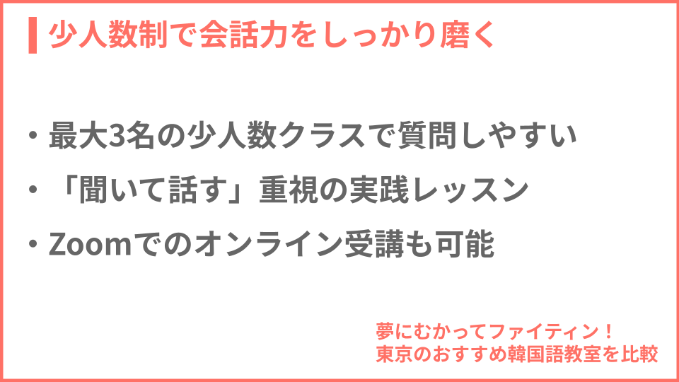 短期間で韓国語を習得したい人や、平日の午前・午後に時間が余っている人に向いたコースです。1クラス最大3名までの少人数制で、効率的な韓国語のレッスンを行います。