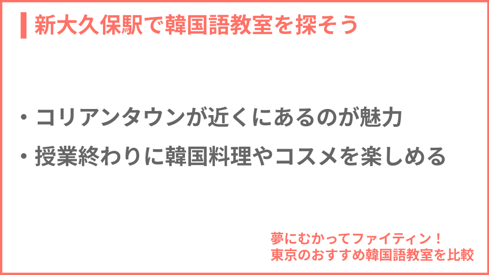 韓国語教室を選ぶ際は、「駅近で通いやすい韓国語教室」を選んで、レッスン料金の安さを比較することが大切です。ここではコリアンタウンがある「新大久保エリア」にフォーカスを当て、新大久保駅から徒歩5分以内の場所にある韓国語教室をピックアップ!グループレッスン(月4受講)の料金を徹底比較しています。